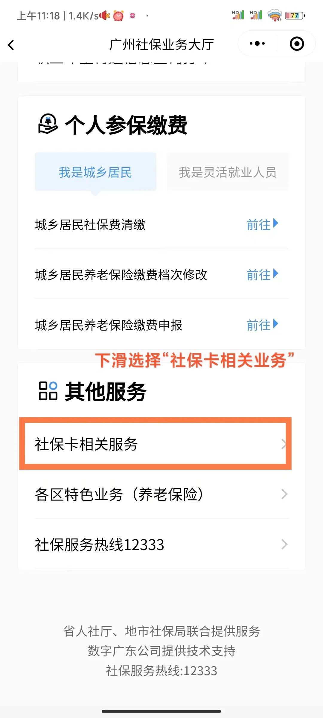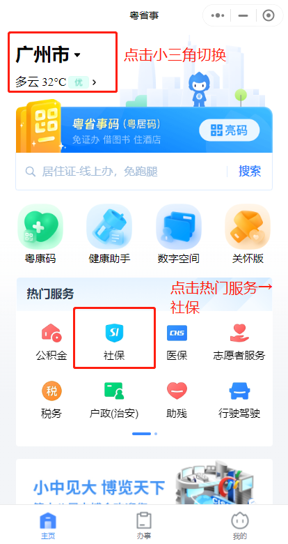 进入小程序首页,点击右上方切换城市,然后点击”社保“;