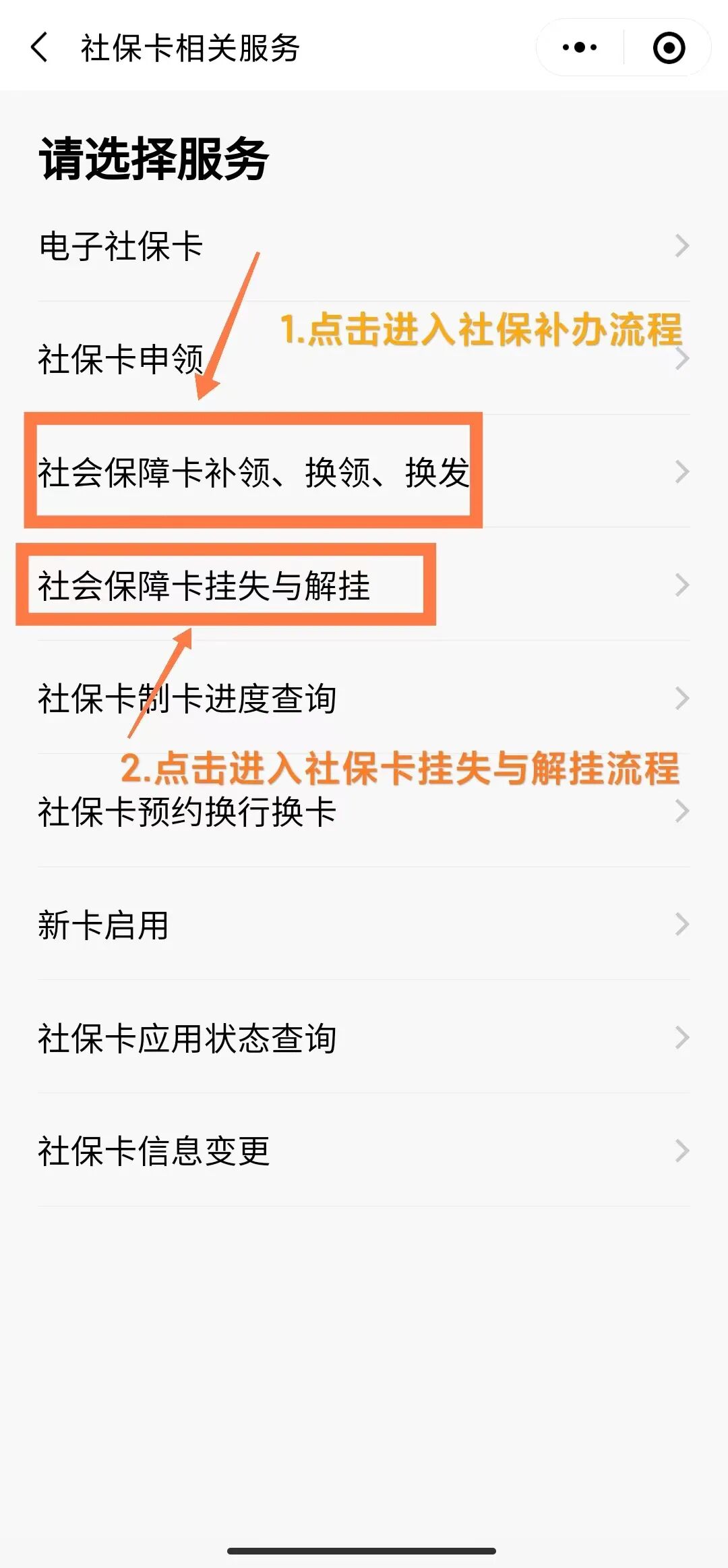 3、页面跳转后选择“社会保障卡补领、换领、换发”可以进行相关业务办理。社保卡的挂失与解挂也可以在此点击办理;